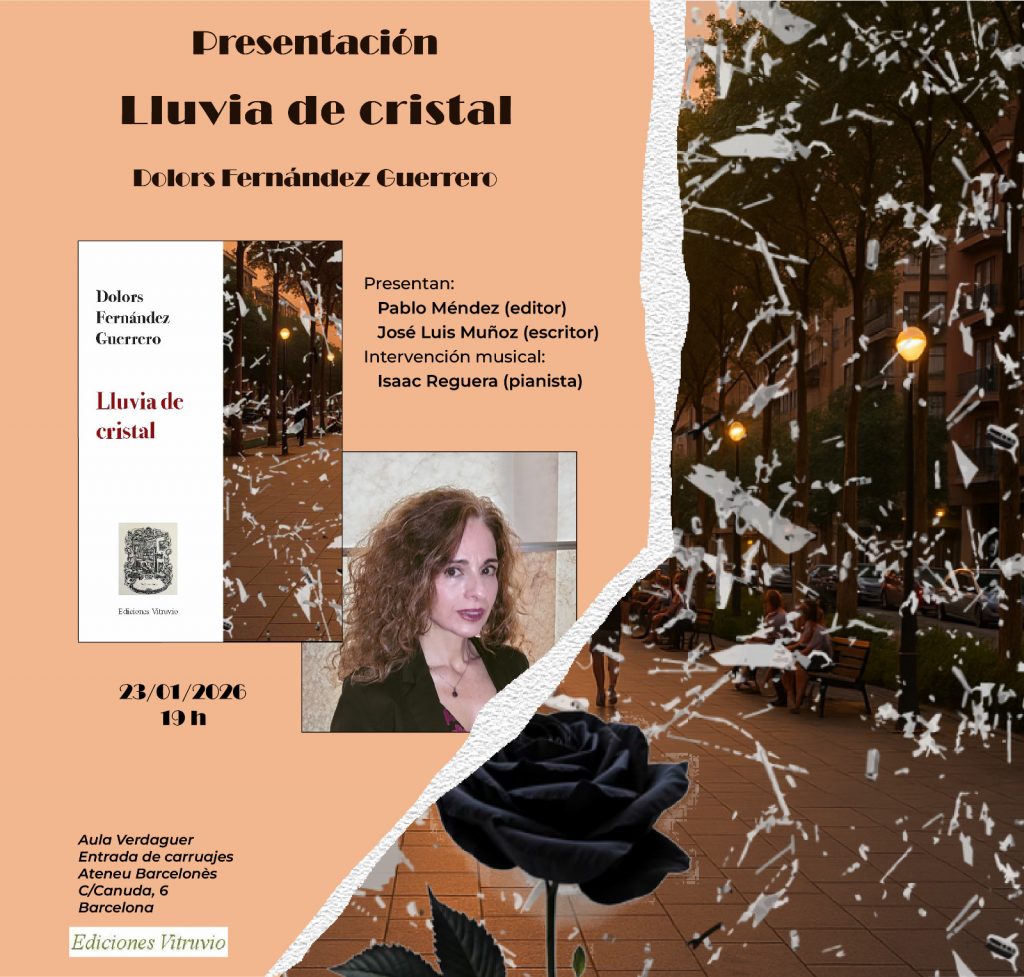 Desde octubre de 2024 mi Lluvia de cristal, editada por Ediciones Vitruvio, se ha hecho esperar, pero su inminencia es ya una realidad. He aquí la portada, en penumbra, como la historia que cuenta, salpicada de esquirlas de cristal que duelen y maltratan, que conjeturan hipótesis y que lavan heridas. La lluvia caudalosa, torrencial es destrucción y muerte, pero en su justa medida supone vida, renovación y esperanza. En esos márgenes, al borde apenas del desastre, transcurre mi Lluvia de cristal.
